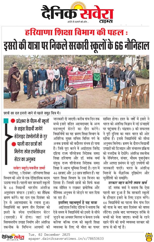 हरियाणा शिक्षा विभाग की पहल : इसरो की यात्रा पर निकले सरकारी स्कूलों के 66 नौनिहाल